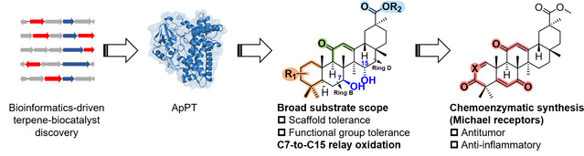 细胞色素P450酶因具有精密的底物识别与催化能力,被认为是实现惰性C–H键精准活化的理想工具。但此前可作用于五环三萜的P450酶均来自真核生物,受膜结合特性限制,普遍存在异源表达困难、应用受限等问题。为此,研究团队创新性地发展了“萜类合酶-P450”定向挖掘策略,以细菌萜类合酶为锚点挖掘邻近P450酶,结合高效体外筛选平台,成功从Amycolatopsis pretoriensis中发现首个原核来源的五环三萜修饰P450酶——ApPT(CYP161H12)。该酶通过1,5-氢原子转移机制,实现了B环C-7β和D环C-15α位点的高效、高选择性活化,总收率达99%,突破了化学方法难以实现的无导向基团、高立体选择性C–H键官能化难题,并实现克级制备。机制研究进一步揭示了酶促1,5-氢原子转移介导的C7-to-C15接力氧化规律,拓展了生物催化自由基化学的研究边界。在此基础上,团队通过“化学-酶”法合成获得了一系列具有抗肿瘤、抗炎活性的迈克尔受体分子,其中部分B环新颖衍生物展现出良好的先导药物开发潜力。